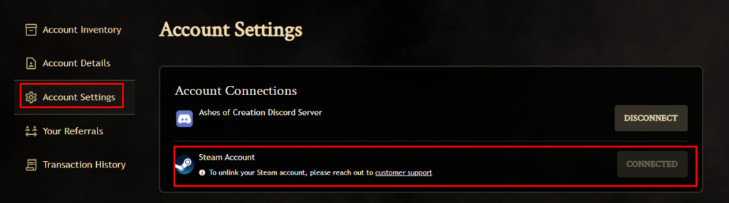 Bitte denkt daran, das jeder Ashes of Creation Account nur mit einem Steam Account verlinkt werden kann. Habt Ihr also mehrere Ashes Accounts, benötigt Ihr auch mehrere Steam Accounts. Achtet also unbedingt darauf, für euren Ashes Haupt Account auch euren Steam Haupt Account zu nutzen.